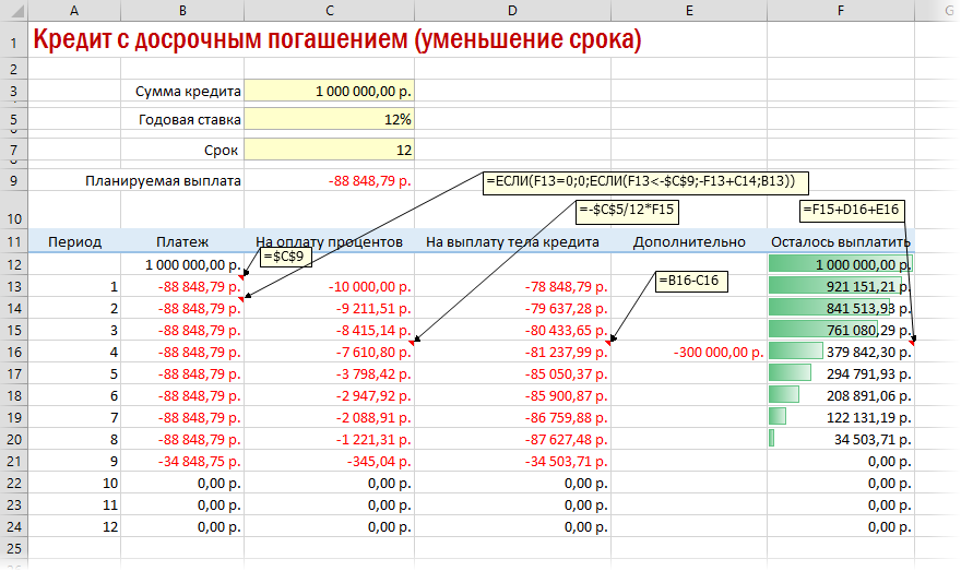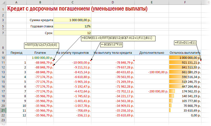 - Рассчитать долю платежа, необходимую для погашения части долга, по формуле «=-ПМТ-(ПС-ПС1)*ставка=-ПМТ-(ПС +ПМТ+ПС*ставка)».