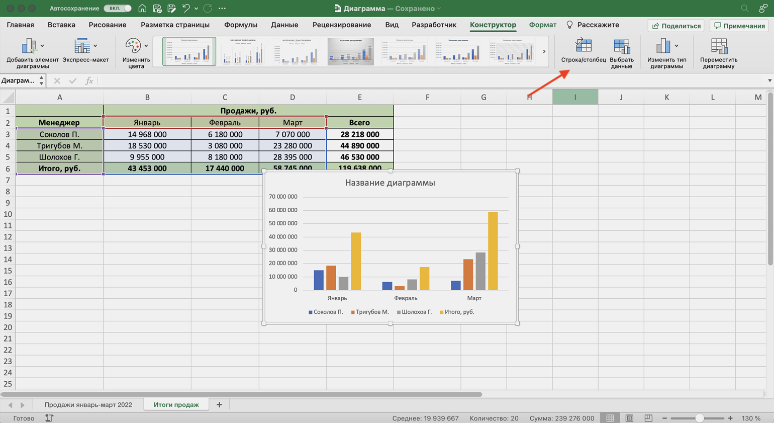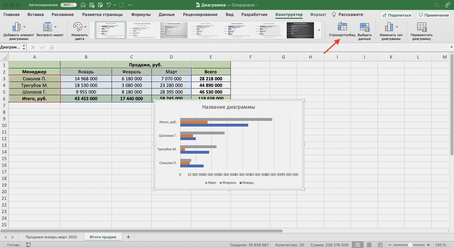 Чтобы сделать акцент на месяцах, нужно поменять значения осей. Для этого на вкладке «Конструктор» нажмём кнопку «Строка/столбец».