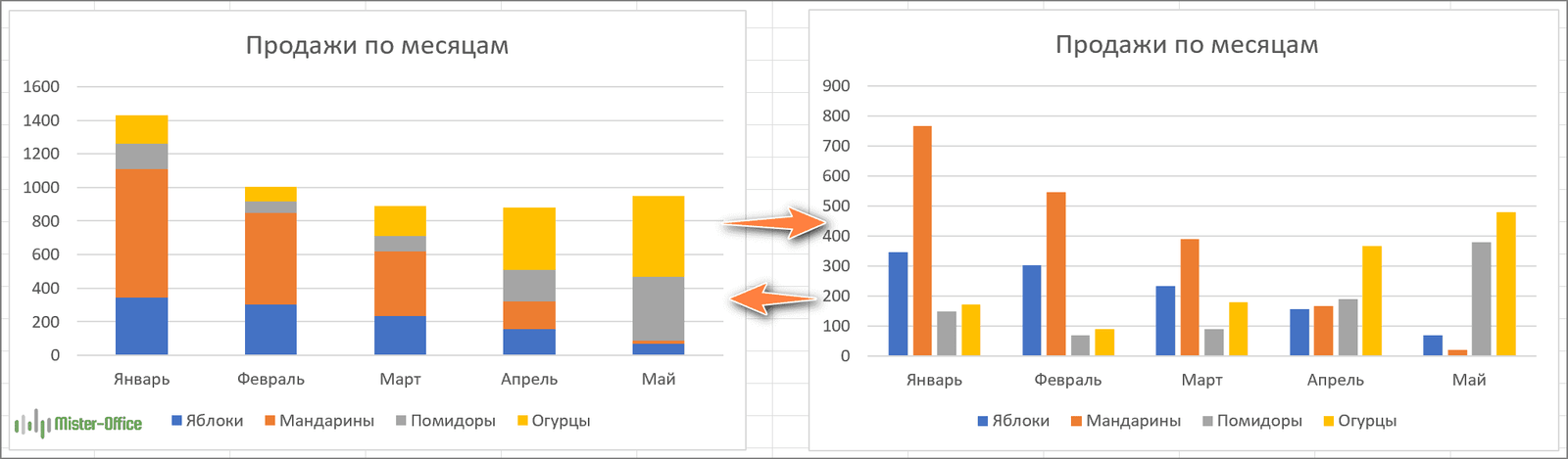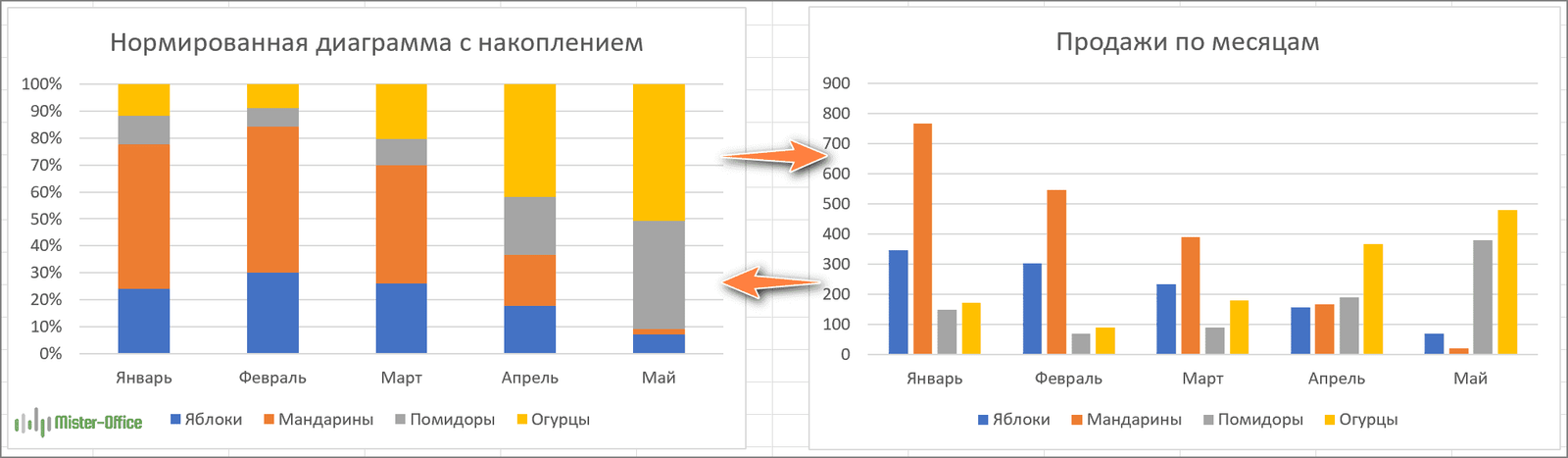 Этот тип гистограмм аналогичен предыдущему типу, но он отображает долю каждого значения внутри каждой категории данных. На рисунке ниже вы можете узнать, как изменяется доля каждого продукта в общей сумме продаж по месяцам. При этом общей суммы продаж мы здесь не видим.