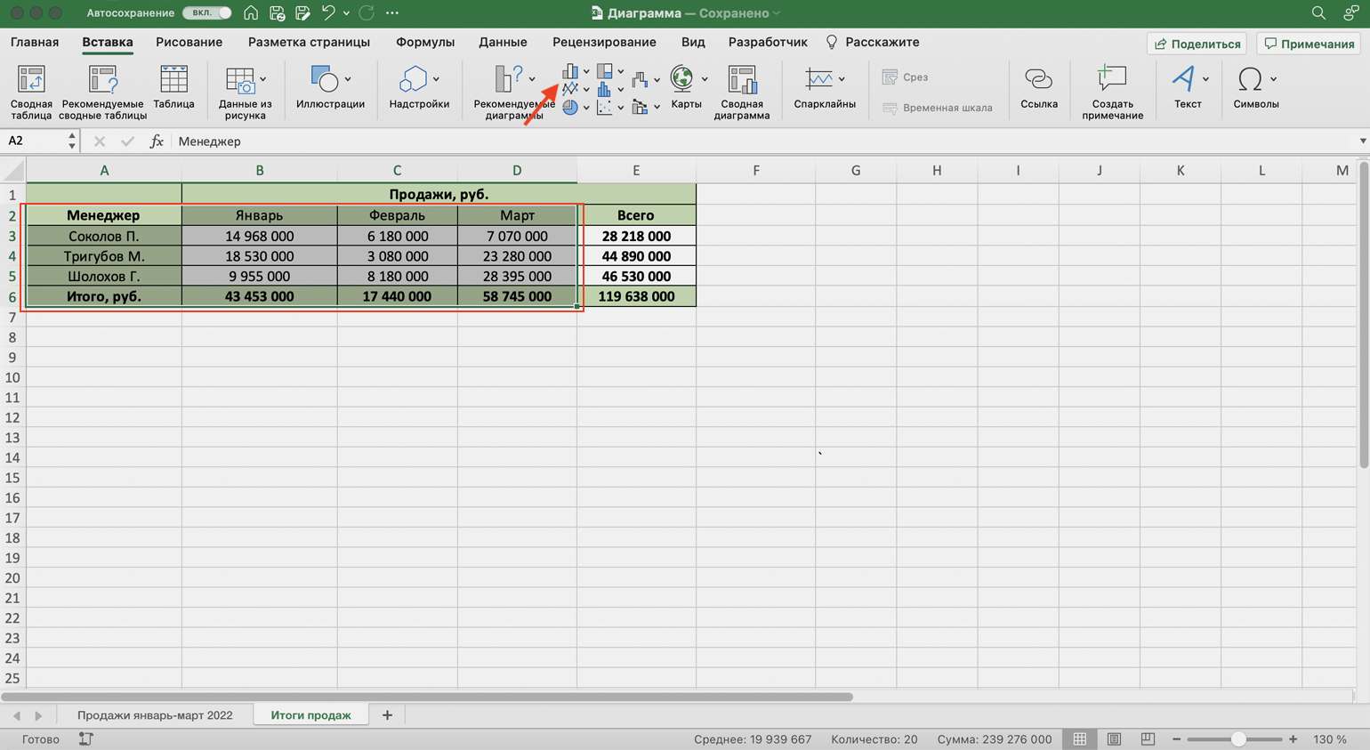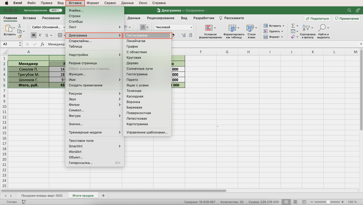 Построим гистограмму. Снова выделим столбец с фамилиями менеджеров и три столбца с ежемесячными продажами, включая строку «Итого, руб.». На вкладке «Вставка» выберем пункты «Диаграмма» → «Гистограмма».