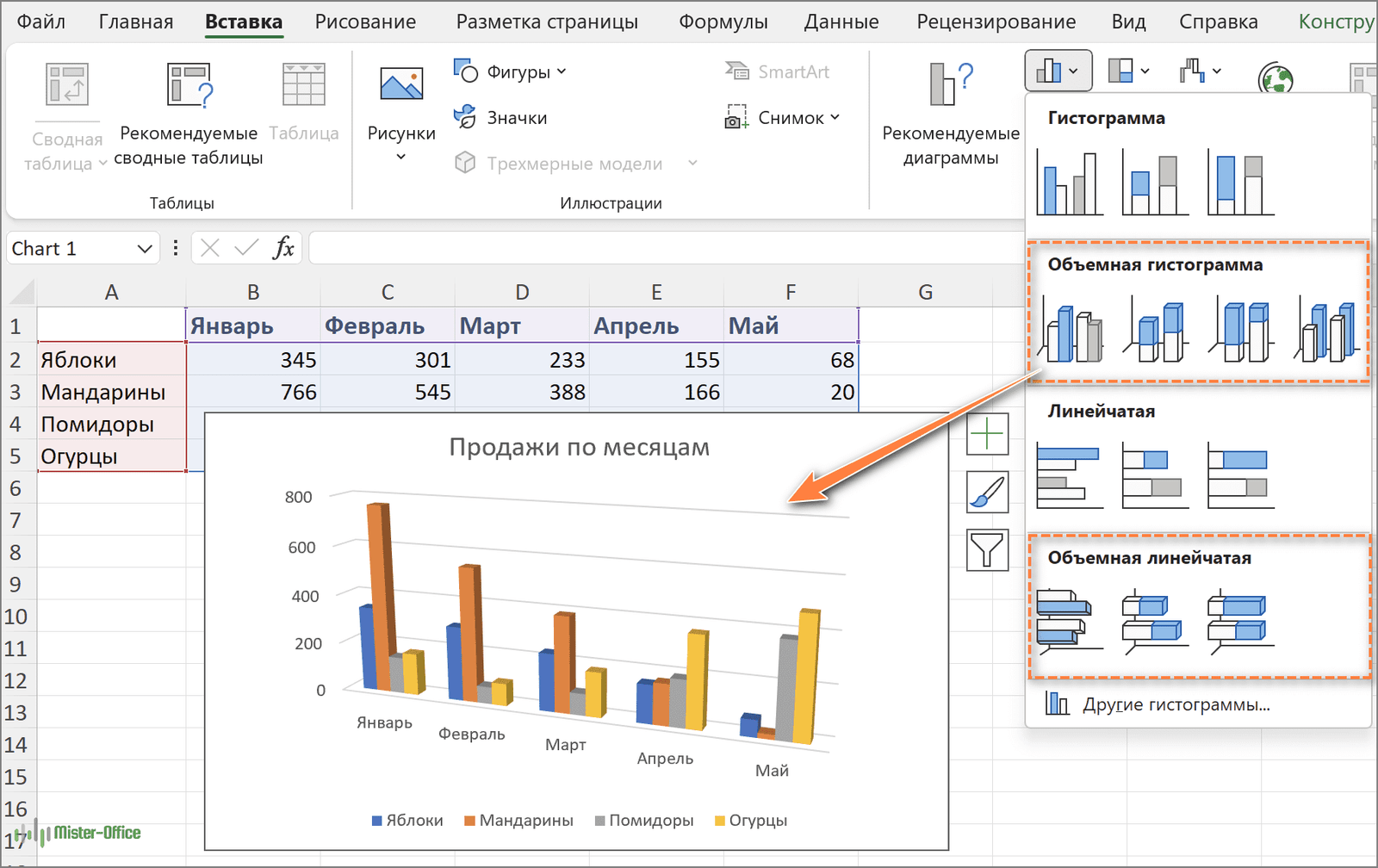 Строим линейчатую диаграмму и гистограмму в Excel