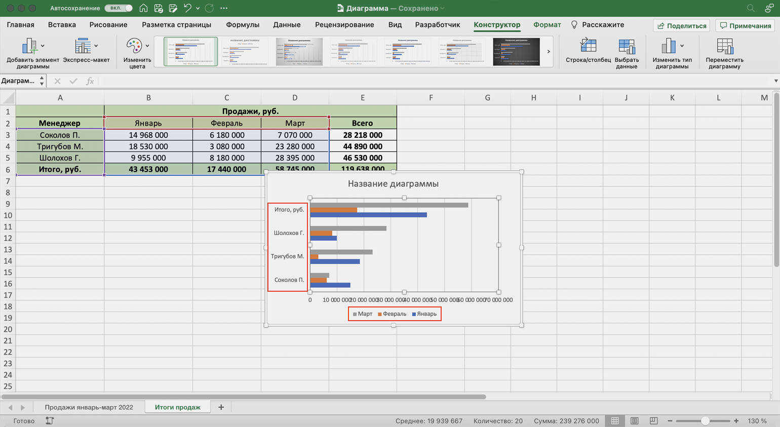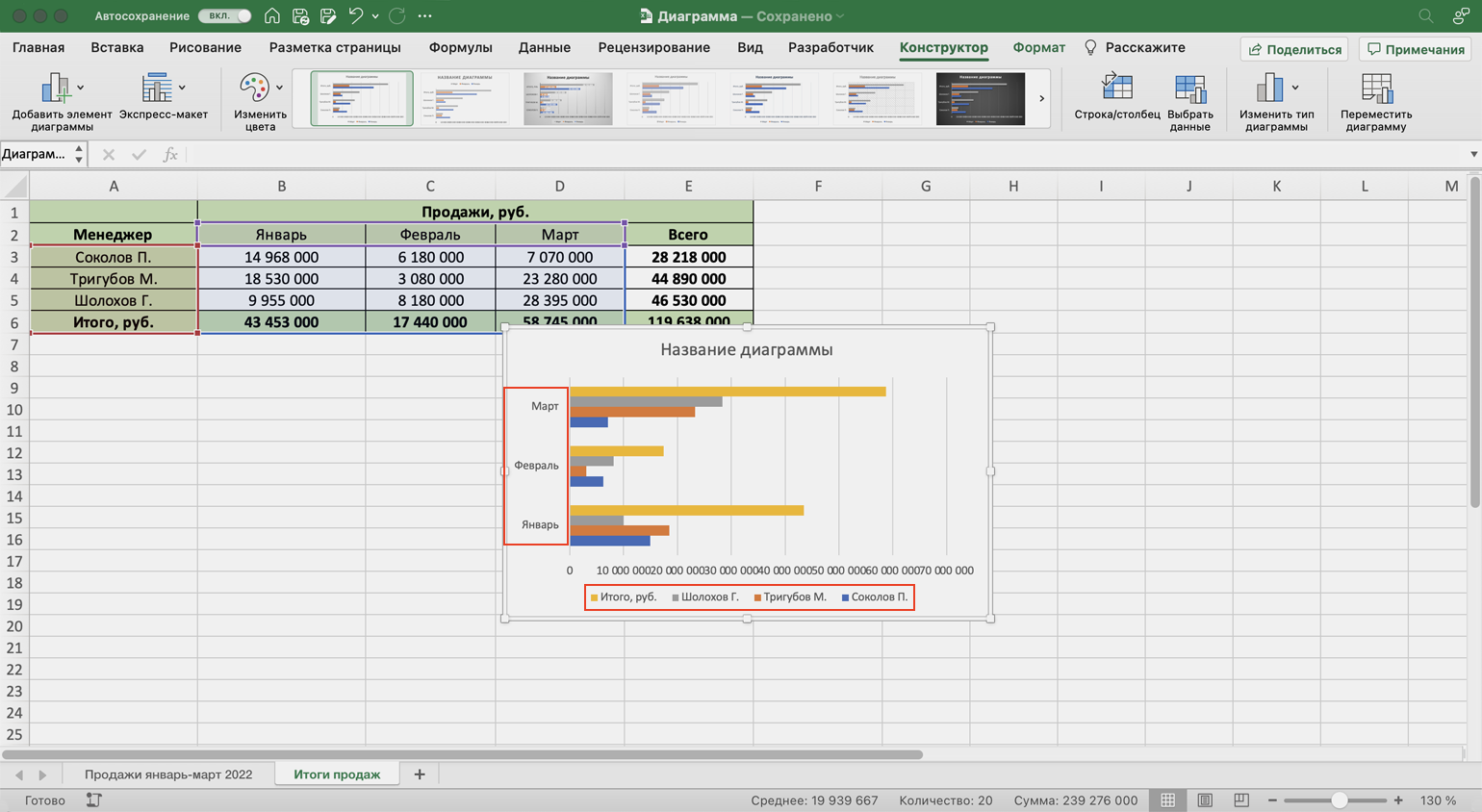 В таком виде диаграмма работает лучше. На ней видно, что больше всего продаж в автосалоне было в марте, а меньше всего — в феврале. При этом продажи каждого менеджера и итог продаж за месяц можно отследить по цветам.