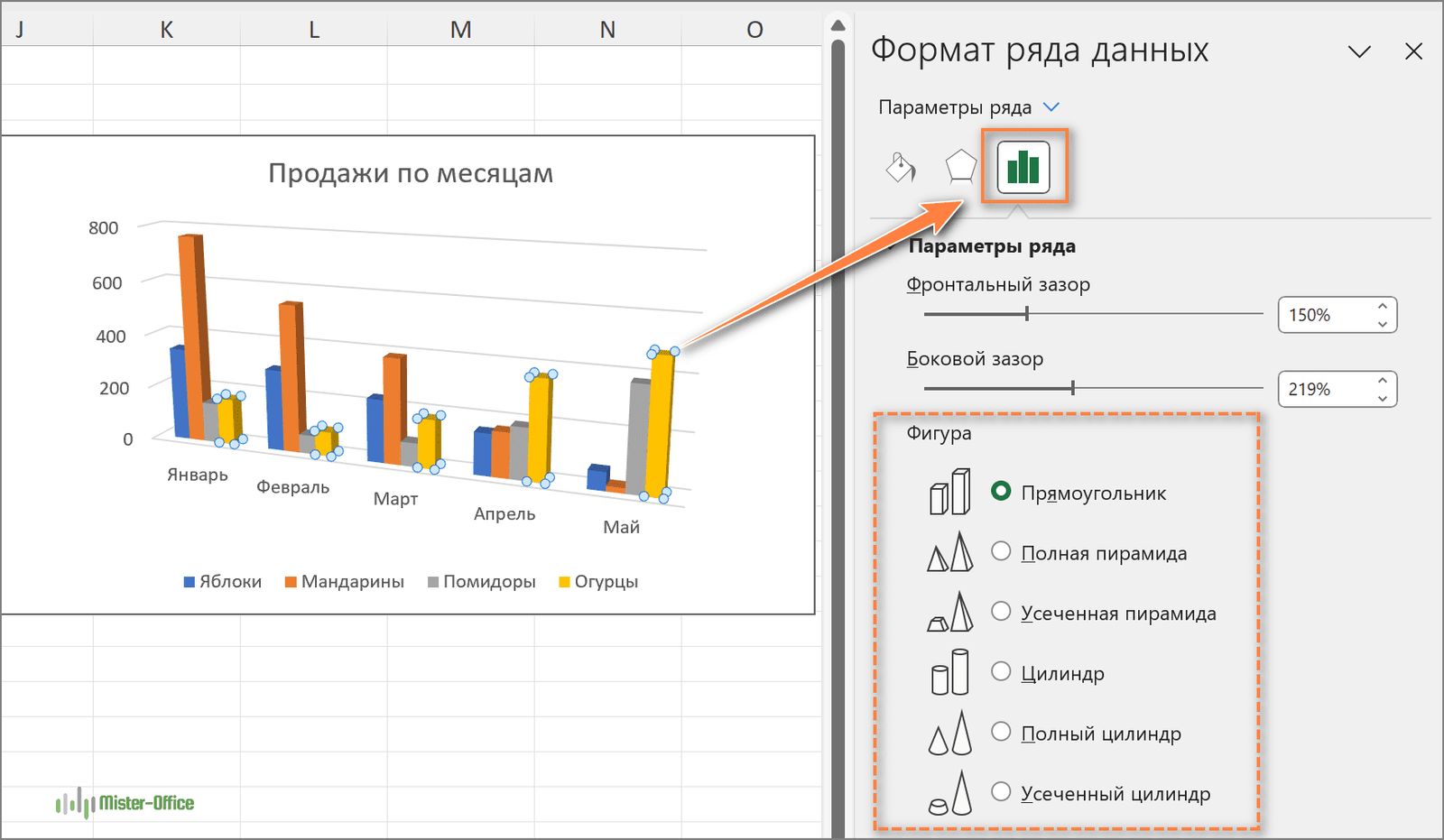 - На панели «Формат ряда данных» в разделе «Параметры ряда» выберите нужную форму столбца.