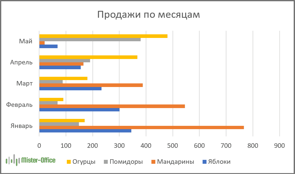 Так линейчатая диаграмма делает больший акцент на месяцах продаж, а не на менеджерахСкриншот: Excel / Skillbox Media