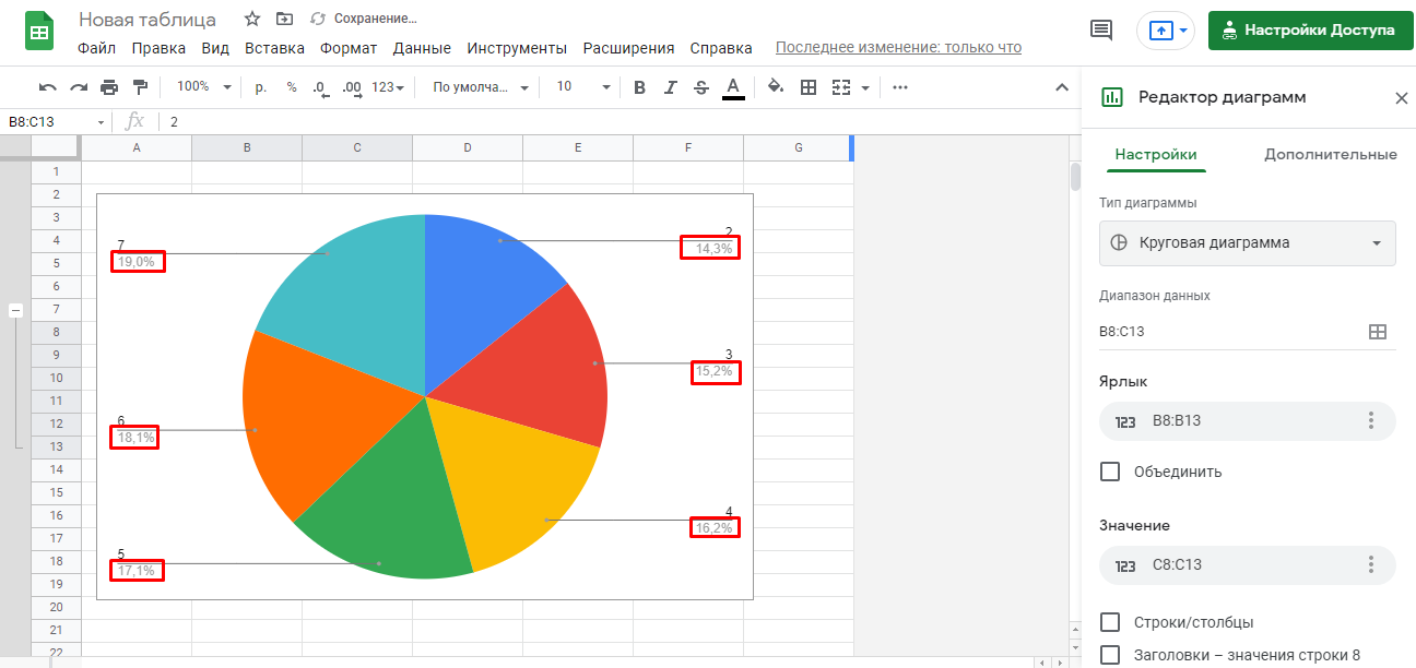 - Если все было сделано верно, около сегментов появятся числа с процентными комментариями.
