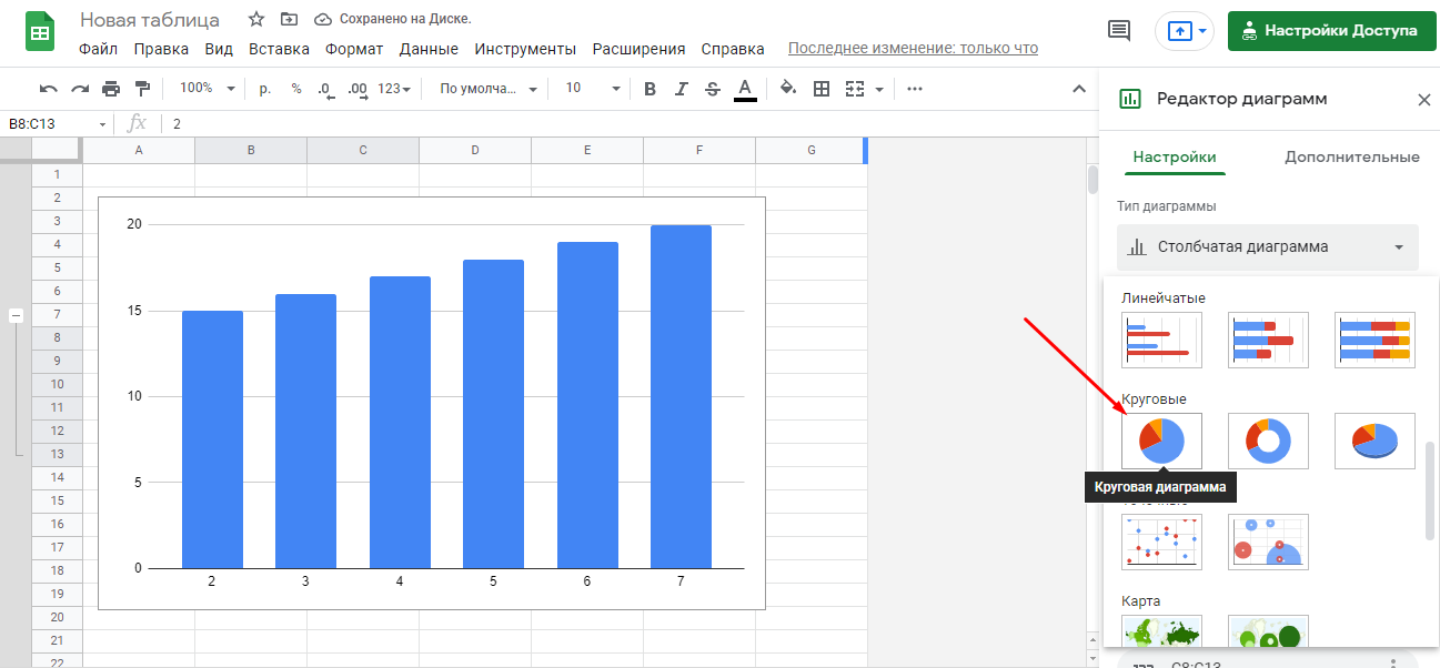 Нажмите кнопку Круговая и дважды щелкните нужный тип диаграммы.