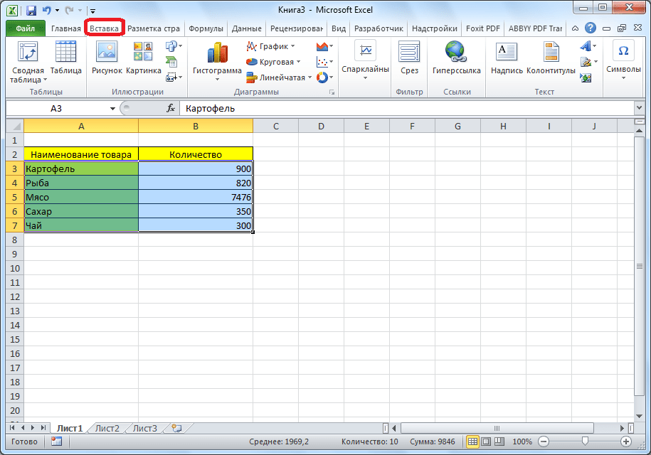 - Перед тем как приступить к созданию любой диаграммы, необходимо построить таблицу с данными, на основе которой она будет строиться. Затем переходим на вкладку «Вставка» и выделяем область таблицы, которая будет выражена в диаграмме.