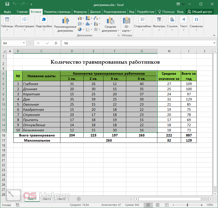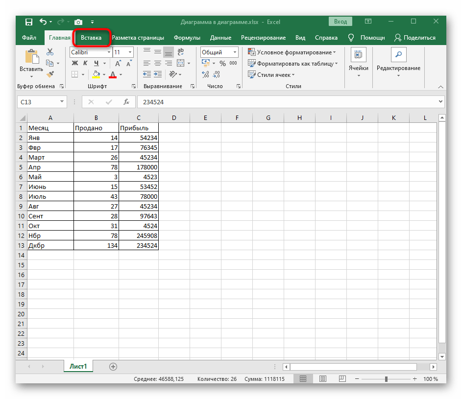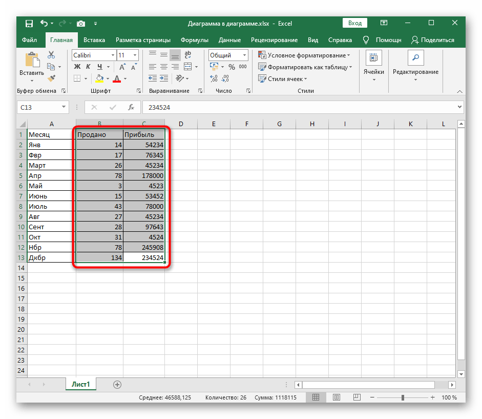 Этот метод показывает, как создать диаграмму в Excel, взяв за основу готовую таблицу и выделив нужные ячейки, которые должны попасть в саму диаграмму. Его можно назвать самым простым, так как пользователю не нужно вводить каждое число вручную и заполнять данные для того, чтобы график отобразил их на листе. Достаточно следовать следующей инструкции, чтобы справиться с поставленной задачей.