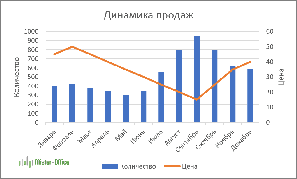 Наконец, вы можете добавить некоторые завершающие штрихи, например ввести заголовок диаграммы и добавить заголовки осей. Оформленная комбинированная диаграмма может выглядеть примерно так: