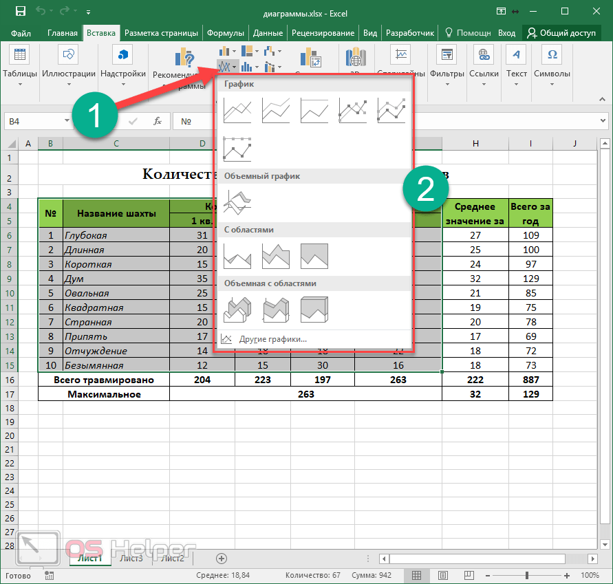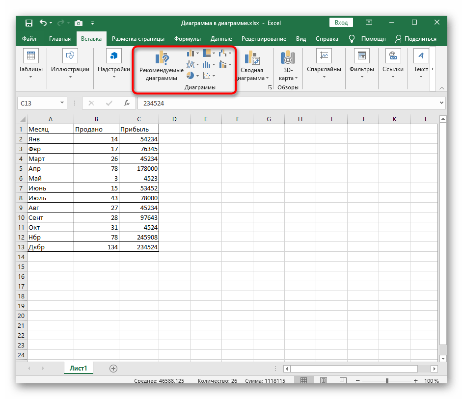 Откройте список с графиками или просмотрите полный их перечень, нажав по кнопке «Рекомендуемые диаграммы».