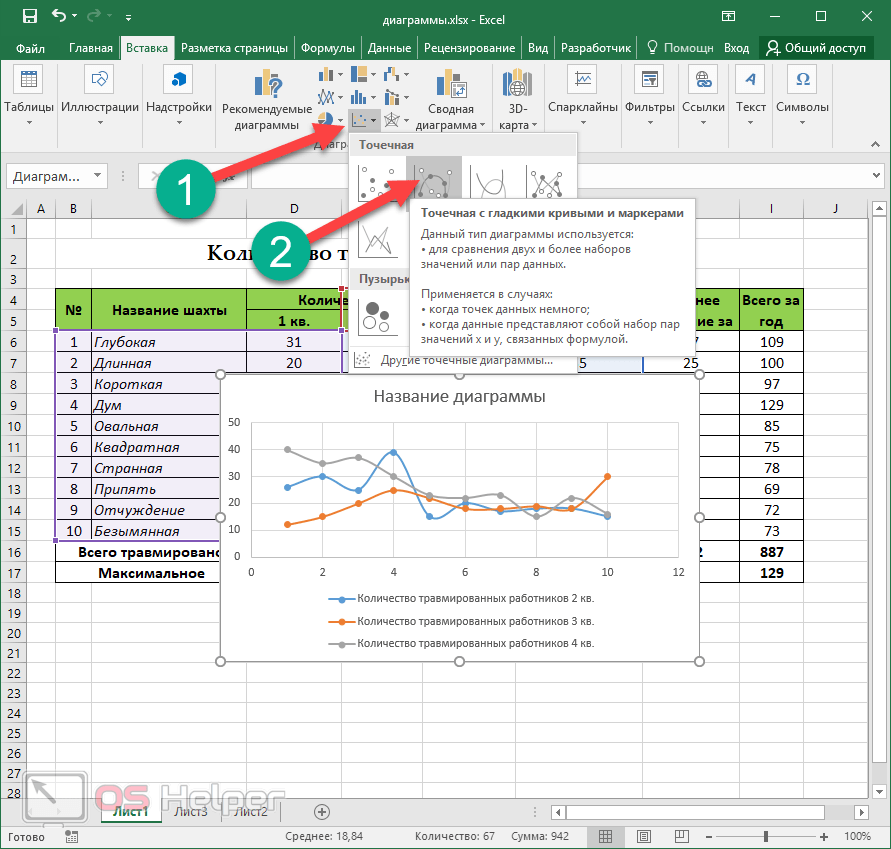 - Делаем точечную диаграмму с прямыми отрезками с использованием столбцов А и В.