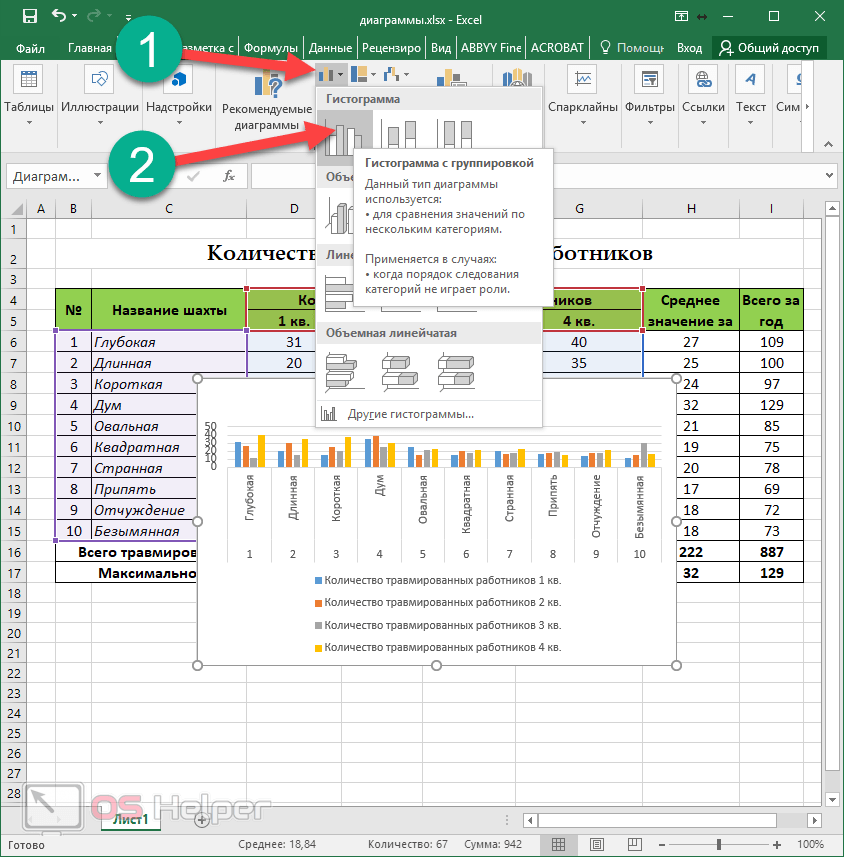 - Нажмите «Гистограмма» (например, она может быть другого типа). Выберите из предложенных вариантов гистограммы.