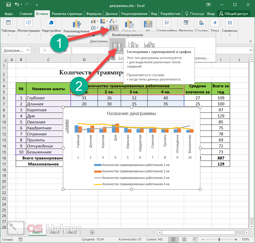 В Microsoft Excel 2010 и более ранних версиях создание комбинированной диаграммы было трудоемкой задачей. Все решалось добавлением второй оси на график. В Excel 2013 — Excel 365 эти сложныерекомендации превращаются в четыре быстрых шага.