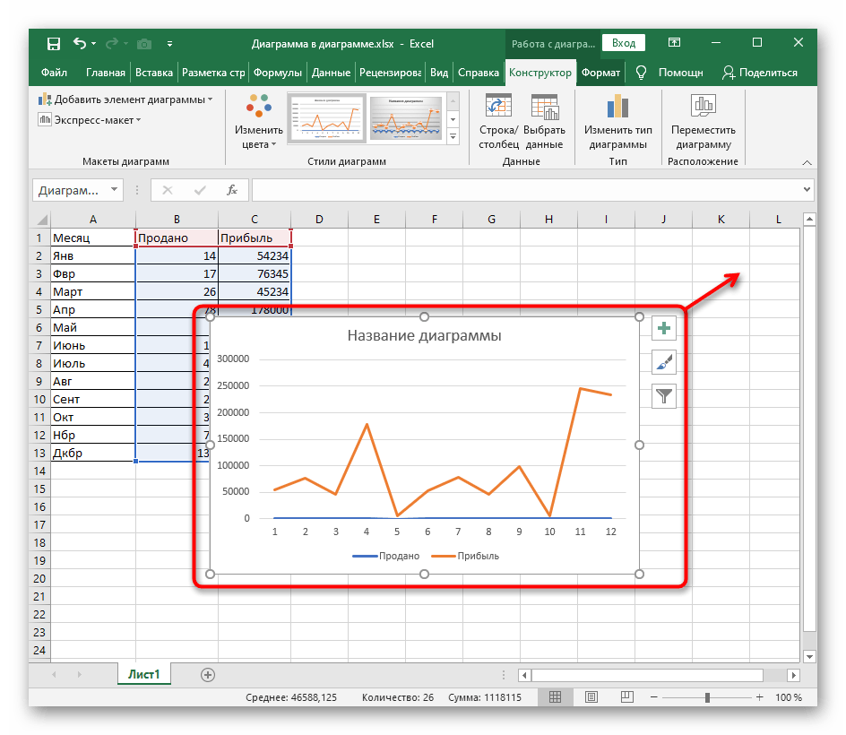 - Предыдущие шаги позволили вставить диаграмму в Excel, после чего ее можно перемещать по листу или изменять размер.