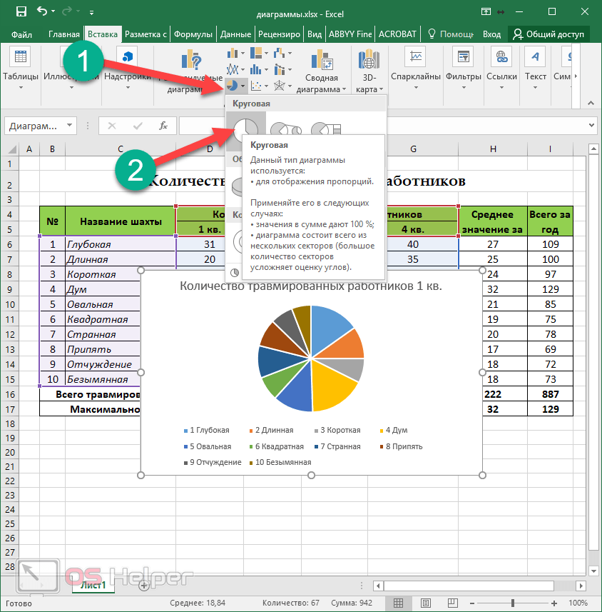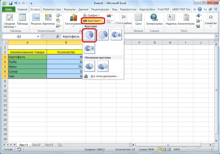 - Аналогично тому, как мы делали выше, строим таблицу, а затем выделяем диапазон данных. Далее переходим на вкладку «Вставка», на ленте указываем круговую диаграмму и в появившемся списке кликаем на любой тип.
