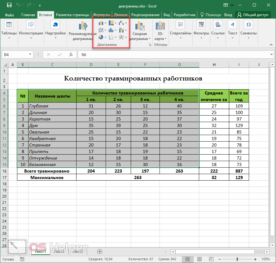 - Там нас интересует блок «Диаграммы», где можно выбрать одну из диаграмм или перейти в окно с рекомендованными.