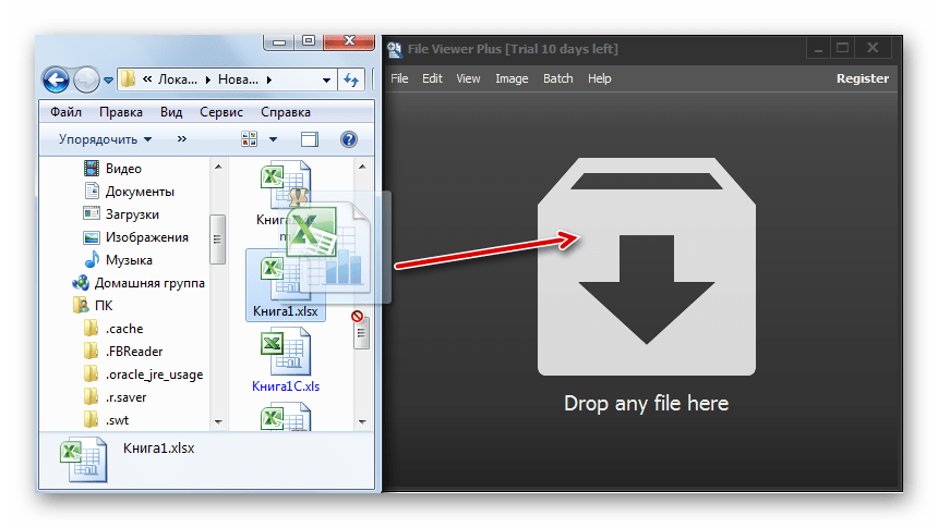 Существует более простой и быстрый способ запуска файла в данном приложении. Нужно выделить наименование файла в Проводнике Windows, зажать левую кнопку мыши и просто перетащить его в окно приложения File Viewer. Файл будет тут же открыт.