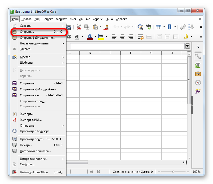 - После запуска стартового окна LibreOffice переходим по пункту «Открыть файл», который является первым в горизонтальном меню, либо жмем сочетание клавиш Ctrl+O.