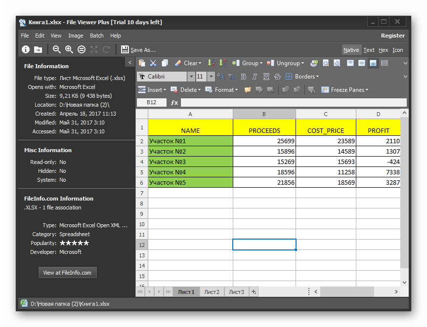 Программа File Viewer Plus специально создана для просмотра файлов различных форматов. Но документы с расширением XLSX она позволяет не только просматривать, но также редактировать и сохранять. Правда, не стоит обольщаться, так как возможности по редактированию у данного приложения все-таки значительно урезаны в сравнении с предыдущими программами. Поэтому лучше её использовать только для просмотра. Также следует сказать, что бесплатный срок пользования File Viewer ограничен 10 днями.