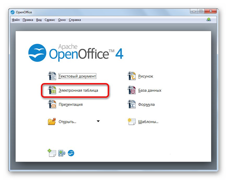 - Запускаем пакет программ OpenOffice. В открывшемся окне выбираем наименование «Электронная таблица».