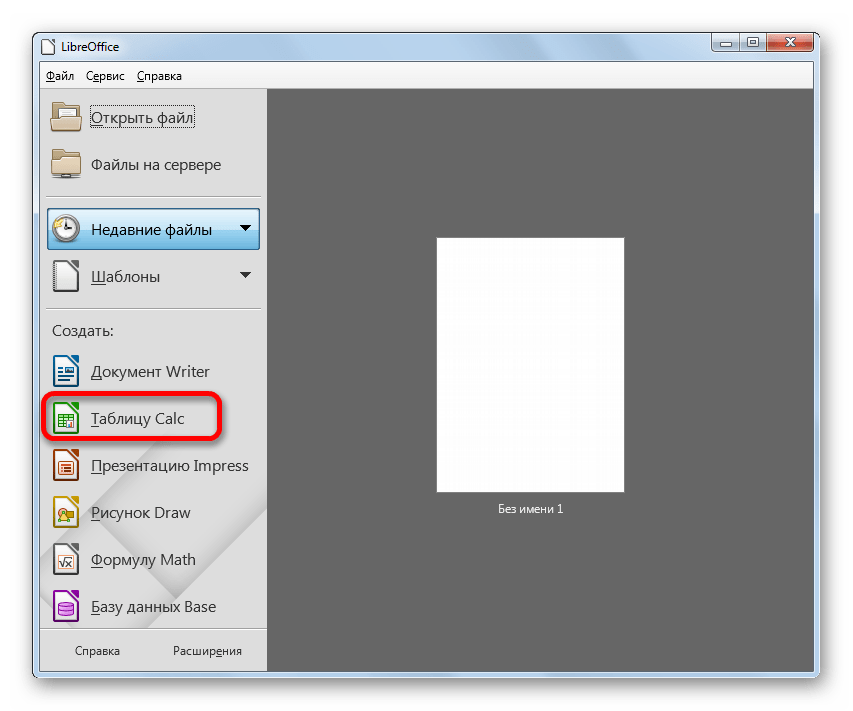 - Запускаем пакет LibreOffice и в блоке «Создать» выбираем пункт «Таблицу Calc».