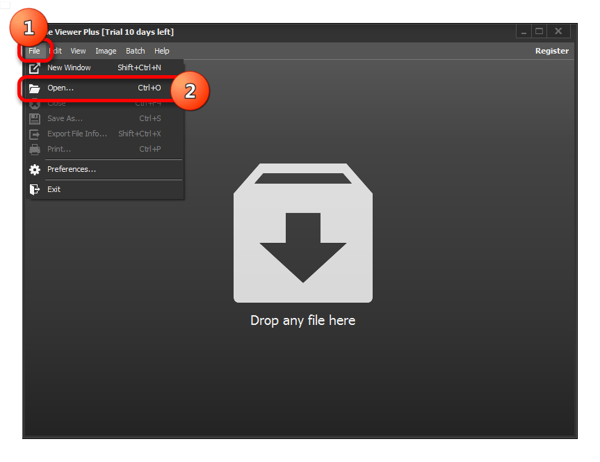 - Запускаем File Viewer и щелкаем по кнопке «File» в горизонтальном меню. В открывшемся списке выбираем вариант «Open…».