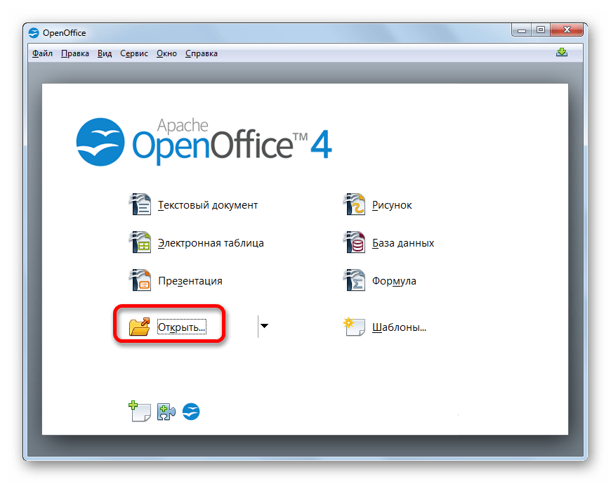 - После запуска стартового окна OpenOffice жмем на кнопку «Открыть…» либо применяем сочетание клавиш Ctrl+O.