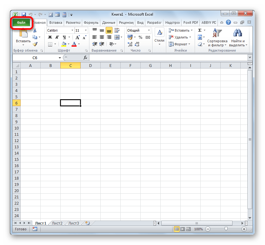 - Запускаем приложение и переходим по эмблеме Microsoft Office в Excel 2007, а в более поздних версиях перемещаемся во вкладку «Файл».