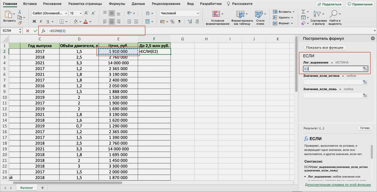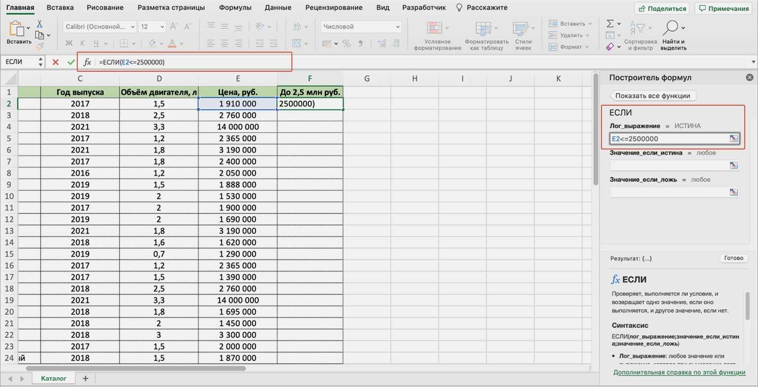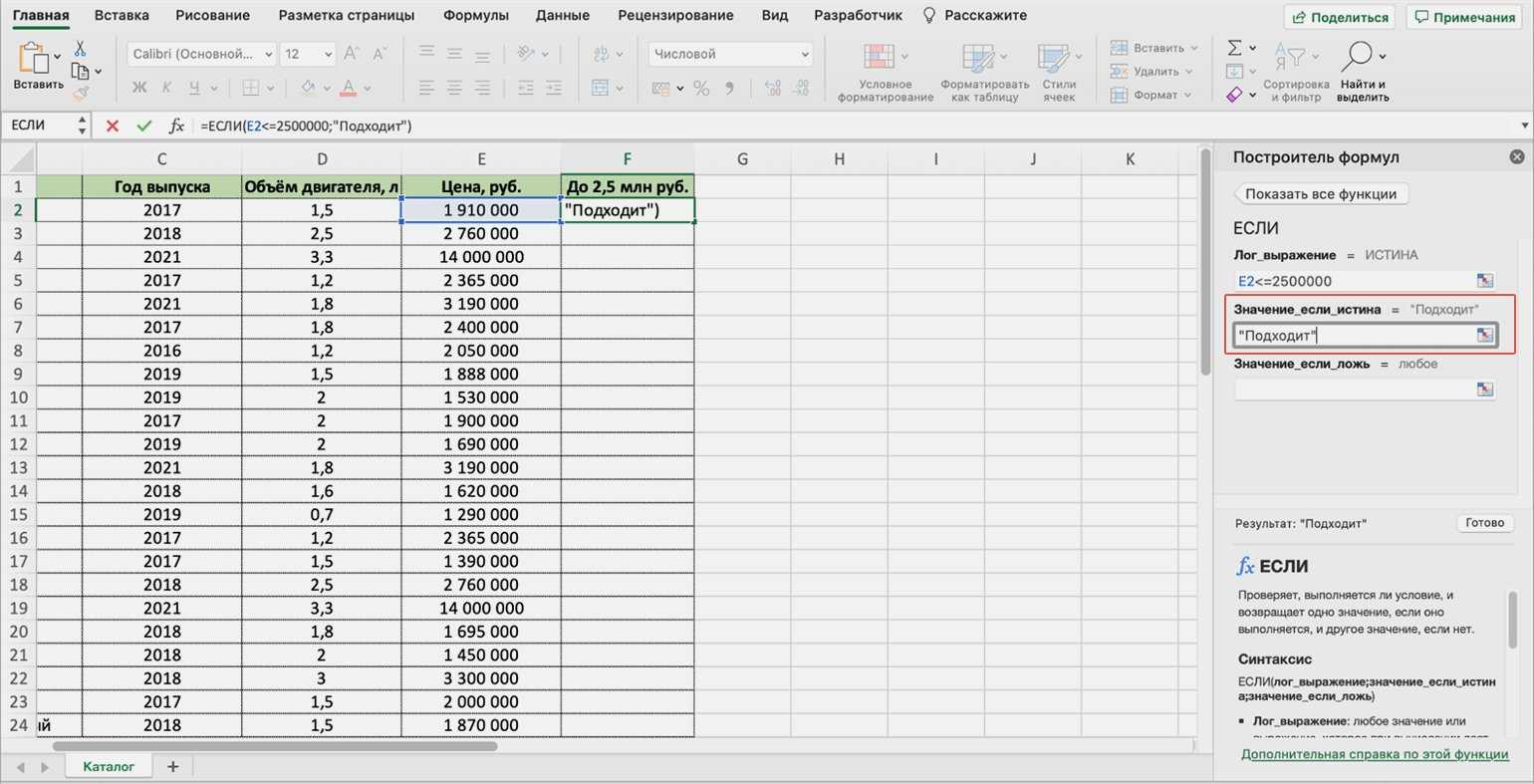 «Значение_если_истина» — результат, который функция принесёт в ячейку, если значение совпадёт с запросом пользователя. В случае с примером — что напишет функция, если проверяемая стоимость авто будет меньше либо равна 2 500 000 рублей.