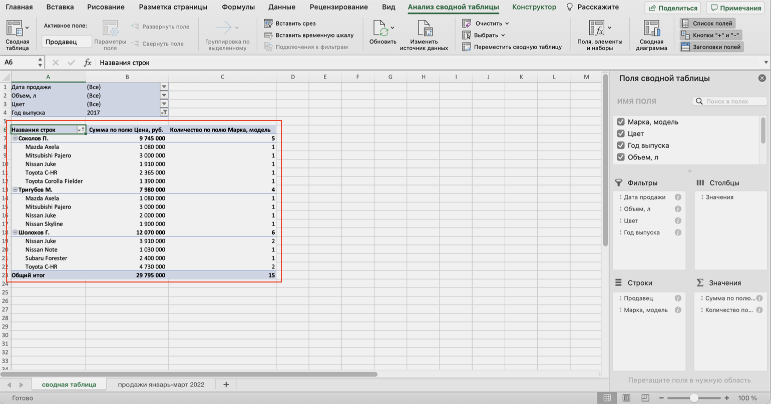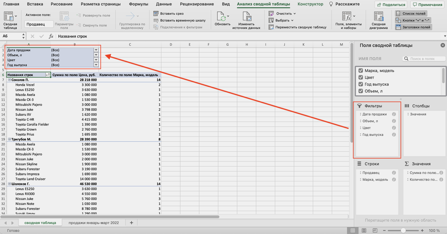 В нашем примере перетянем туда все поля, не вошедшие в основной состав сводной таблицы: объём, дату продажи, год выпуска и цвет.