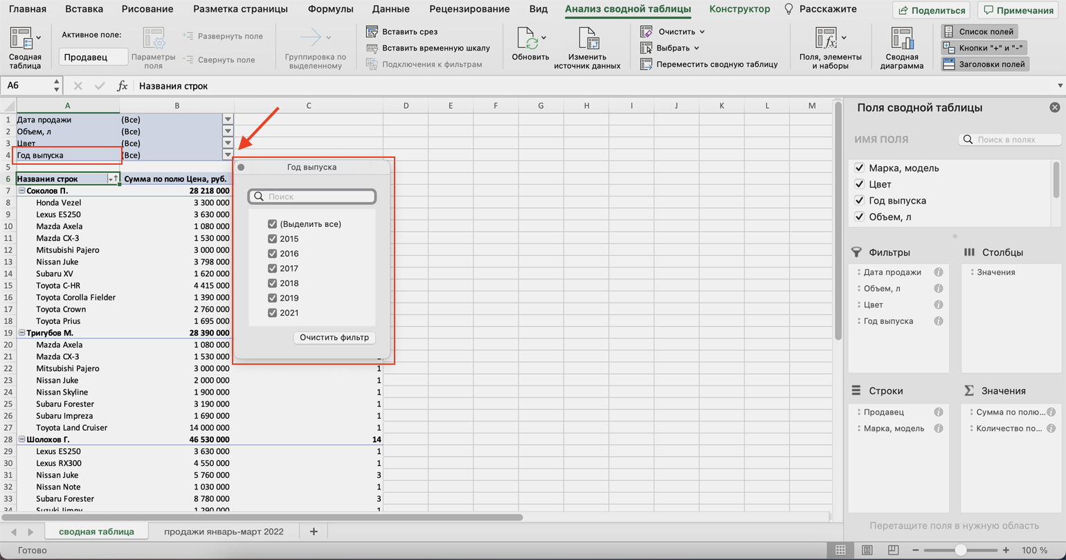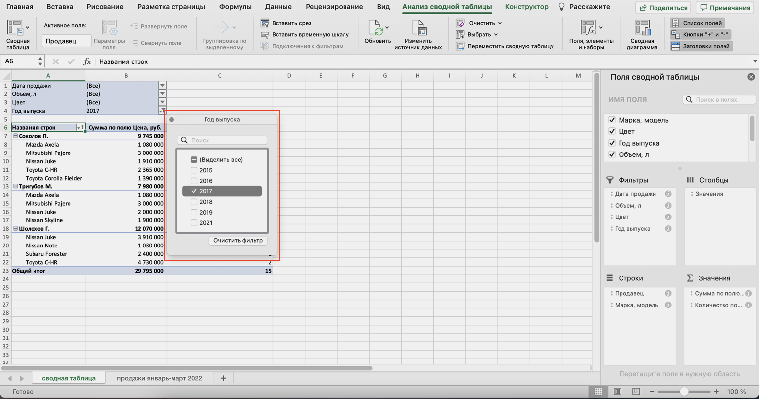 Для примера отфильтруем данные по году выпуска: настроим фильтр так, чтобы сводная таблица показала только проданные авто 2017 года.