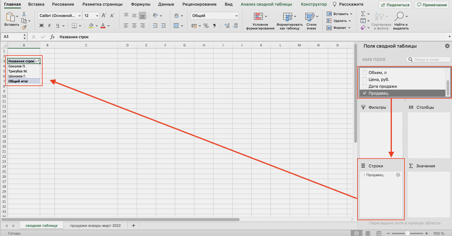 Таблица получится наглядной, если фамилии менеджеров мы расположим построчно. Находим в верхней части панели поле «Продавец», зажимаем его мышкой и перетягиваем в область «Строки».