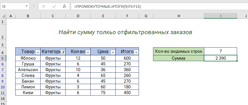 Ключевой особенностью ПРОМЕЖУТОЧНЫЕ.ИТОГИ (SUBTOTAL) является то, что он будет игнорировать строки, которые были «отфильтрованы» из таблицы Excel и строки, которые были скрыты вручную. В приведенном ниже примере ПРОМЕЖУТОЧНЫЕ.ИТОГИ (SUBTOTAL) используется для подсчета и суммирования только 7 видимых строк в таблице:
