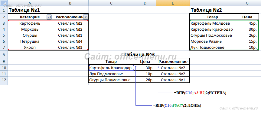 На изображении приведено 3 таблицы. Первая и вторая таблицы располагают исходными данными. Третья таблица собрана из первых двух.В первой таблице приведены категории товара и расположение каждой категории.Во второй категории имеется список всех товаров с указанием цен.Третья таблица содержать часть товаров для которых необходимо определить цену и расположение.
