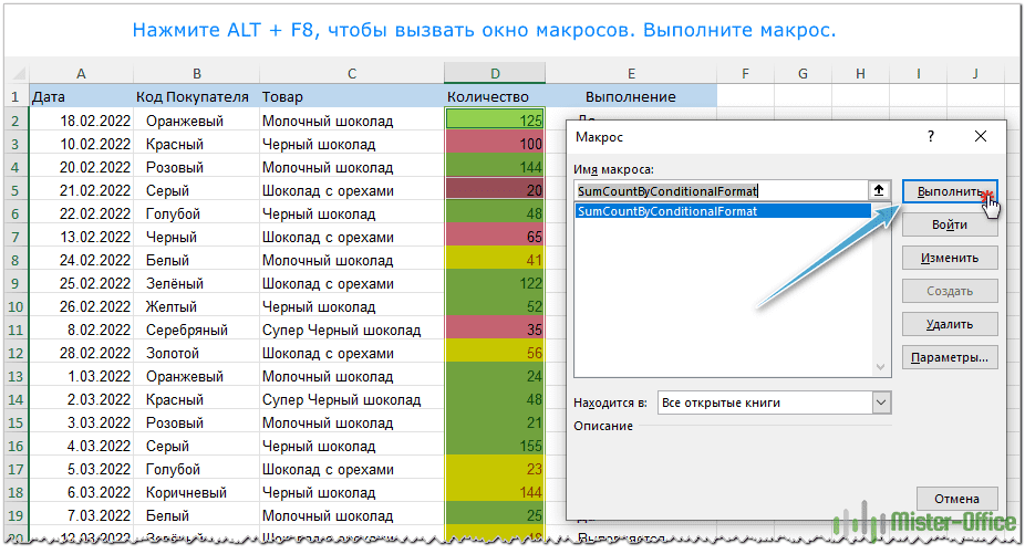 - Выберите макрос SumCountByConditionalFormat и нажмите «Выполнить .