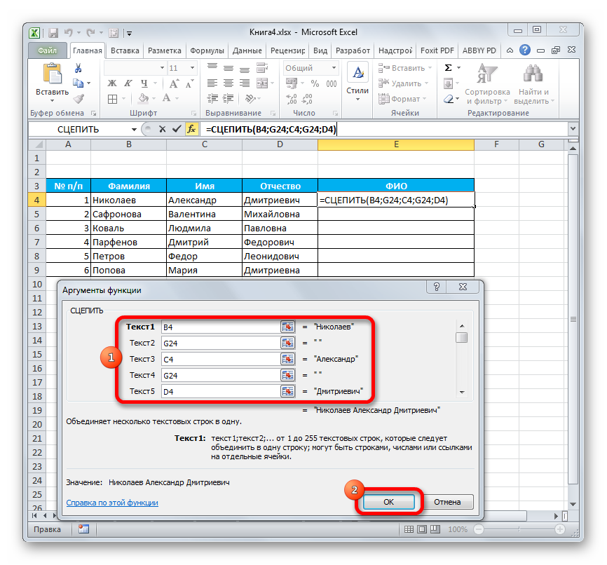 Работа с функцией СЦЕПИТЬ в Microsoft Excel