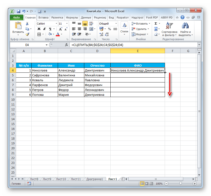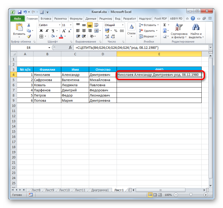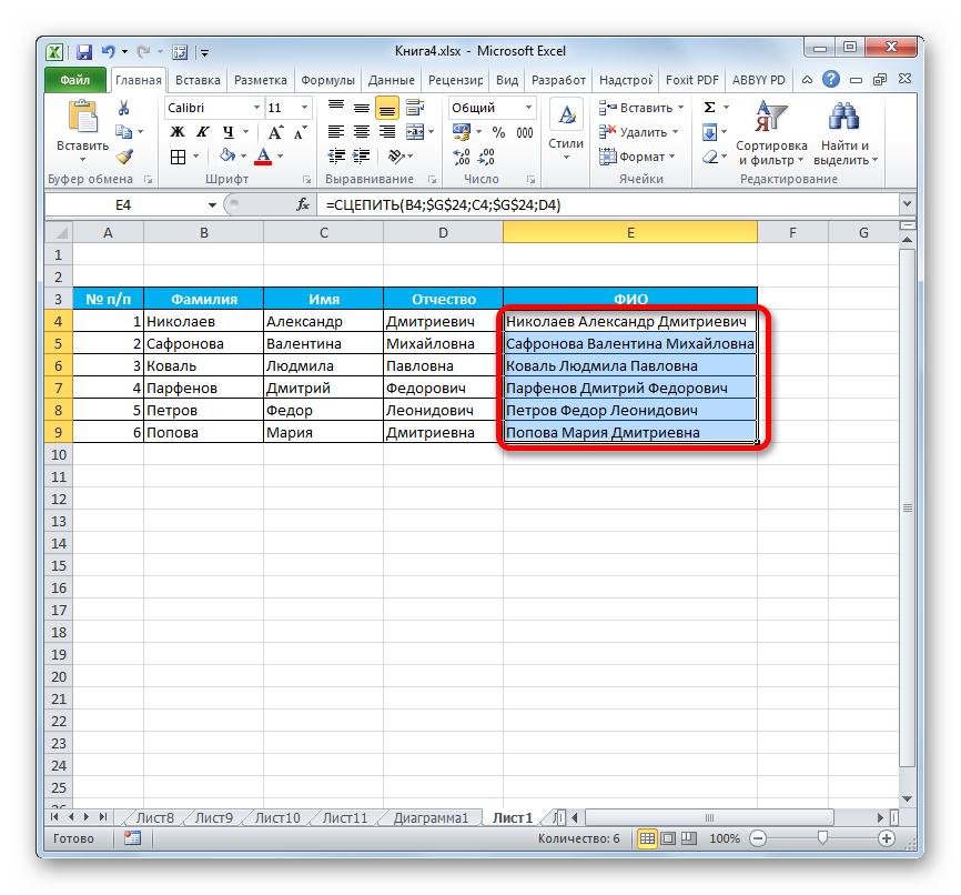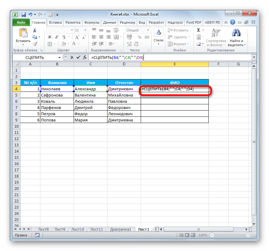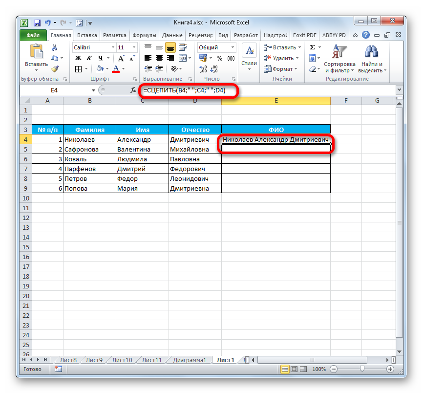 Если мы объединяем текст, предназначенный для чтения, то нужно позаботиться о том, чтобы разделить сцепляемые строки. Поскольку для разделения чаще всего используют пробел, то дополним нашу формулу так, чтобы слова в ФИО были разделены именно пробелами.