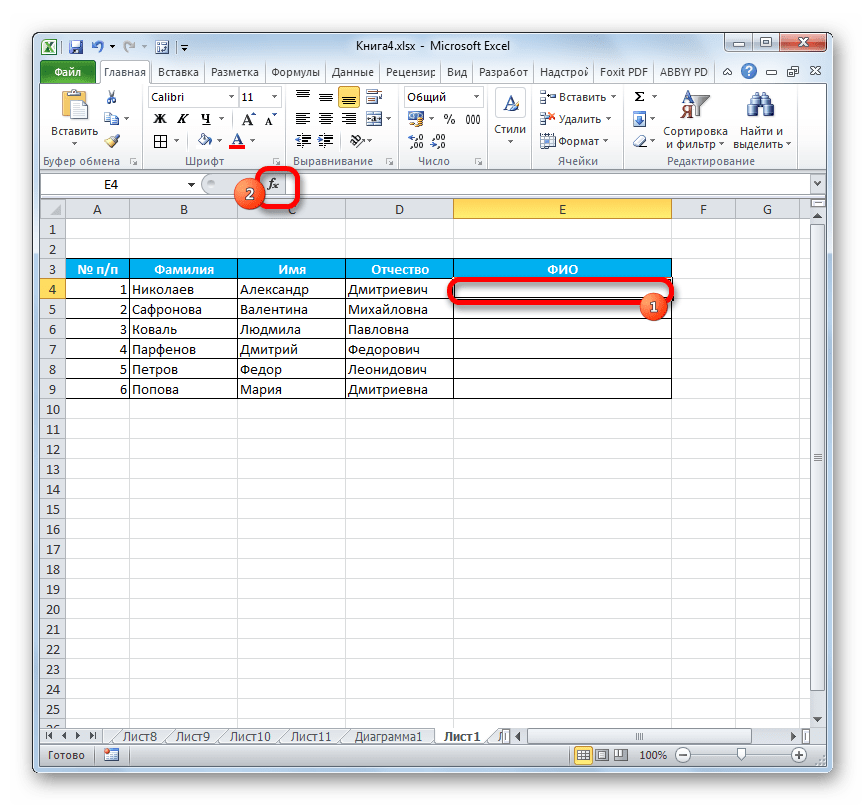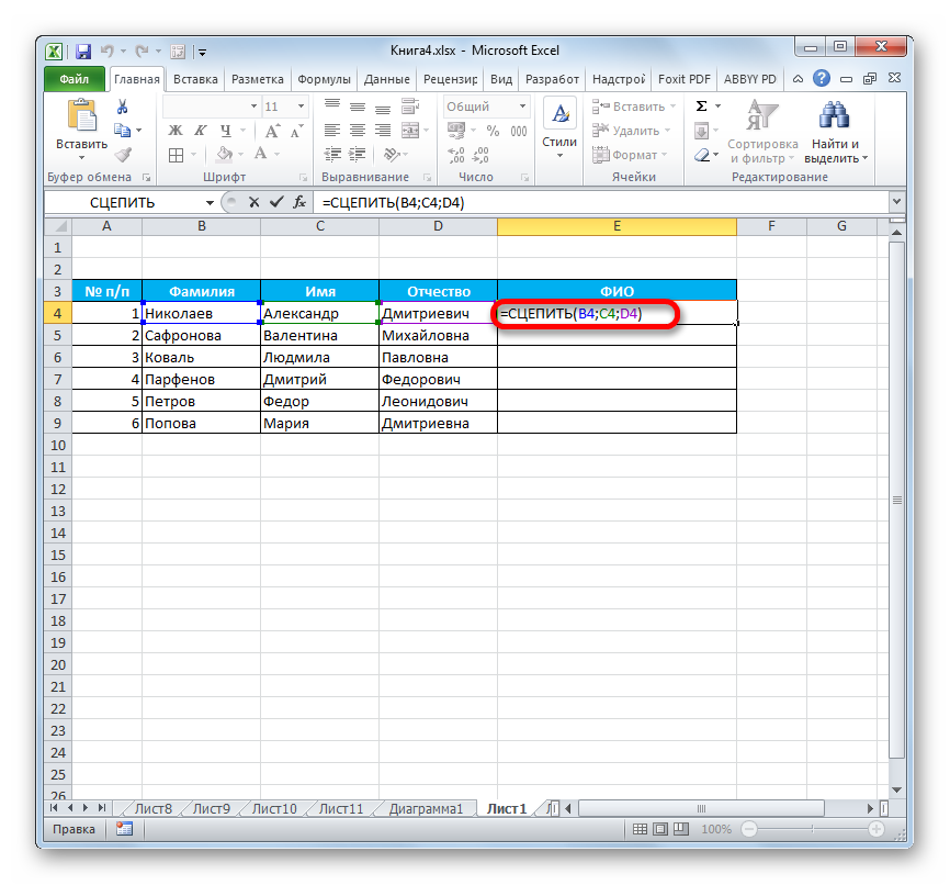 Склеивание через функцию «СЦЕПИТЬ». Допустим, у нас есть отдельно имя, фамилия и отчество. Все эти данные нужно объединить, а для этого сначала склеить их.