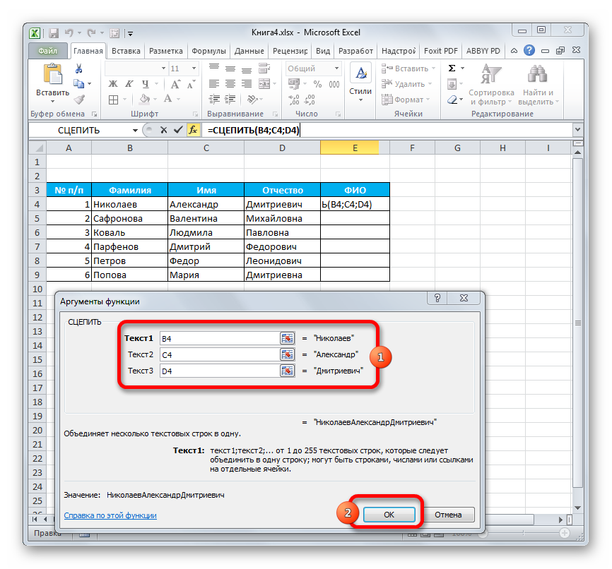 Объединяет текст в ячейке C2, строку, состоящую из запятой и пробела, и значение в ячейке B2. Результат: «Виталий Токарев».
