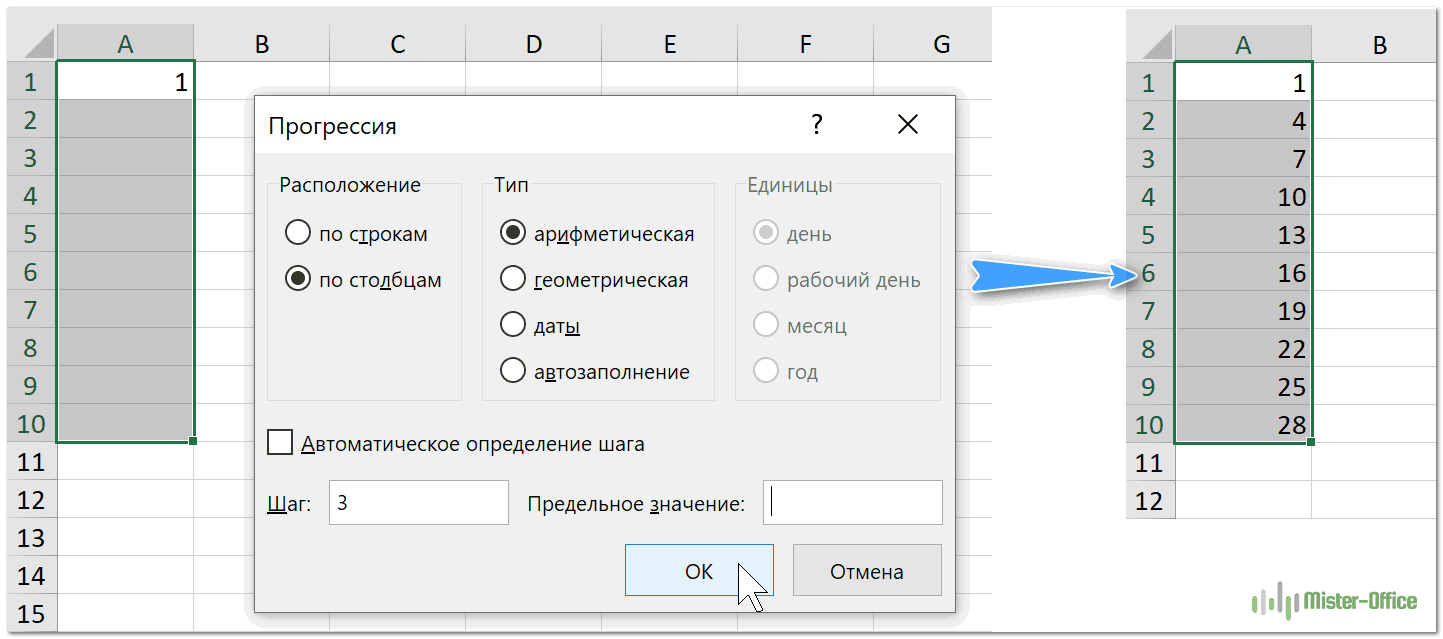 - так как мы изначально выполнили выделение диапазона, уже сразу выбрано соответствующее расположение прогрессии. Однако, его можно изменить при желании, указав другое расположение.
