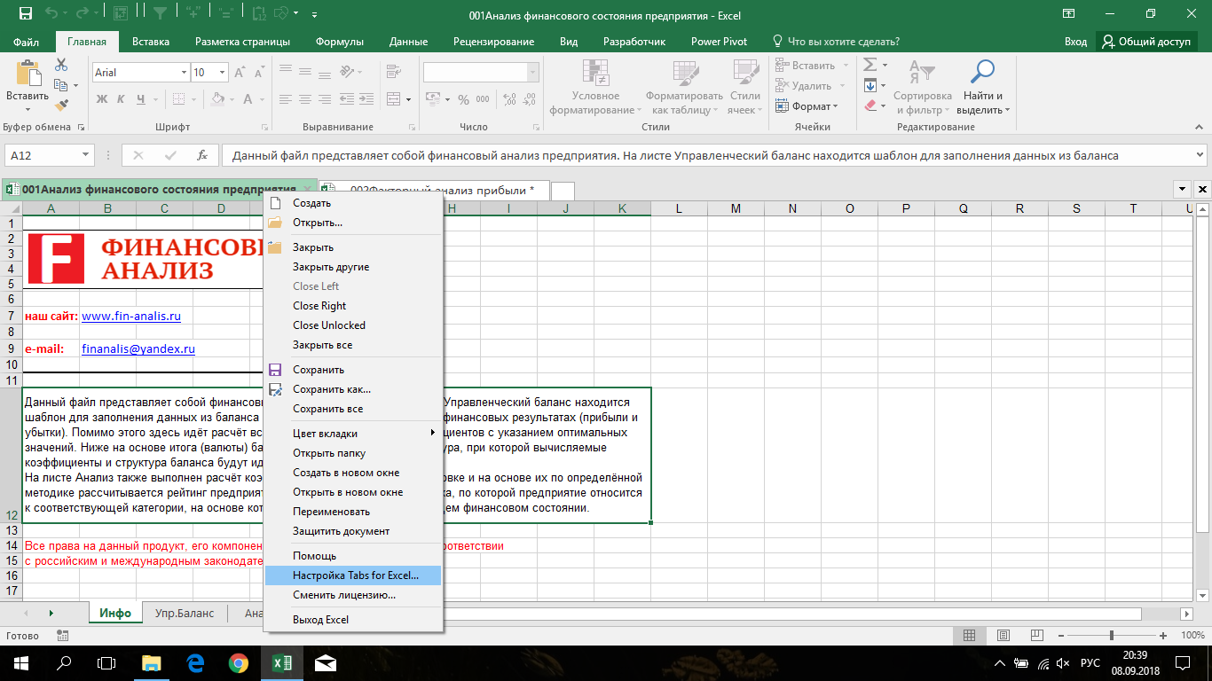 Теперь решение. Видимо, в Microsoft сидят очень заботливые разработчики, поэтому для создания этой проблемы они создали целую отдельную программу-утилиту, которая позволяет открывать документы во вкладках родительской программы. Да, как вы уже поняли, это есть не только в Excel, но и в Word. Кликаем правой кнопкой мышки на вкладку с названием файла и в открывшемся контекстном меню видим пункт «Настройка Tabs for Excel» — это именно та программка, которая создаёт эти проблемы.