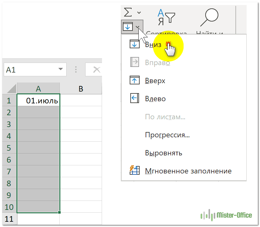 - На ленте щелкаем по значку в виде стрелке вниз (это и есть инструмент “Заполнить”). Откроется перечень возможных вариантов, среди которых выбираем тот, который нужен (“вниз” в нашем примере).