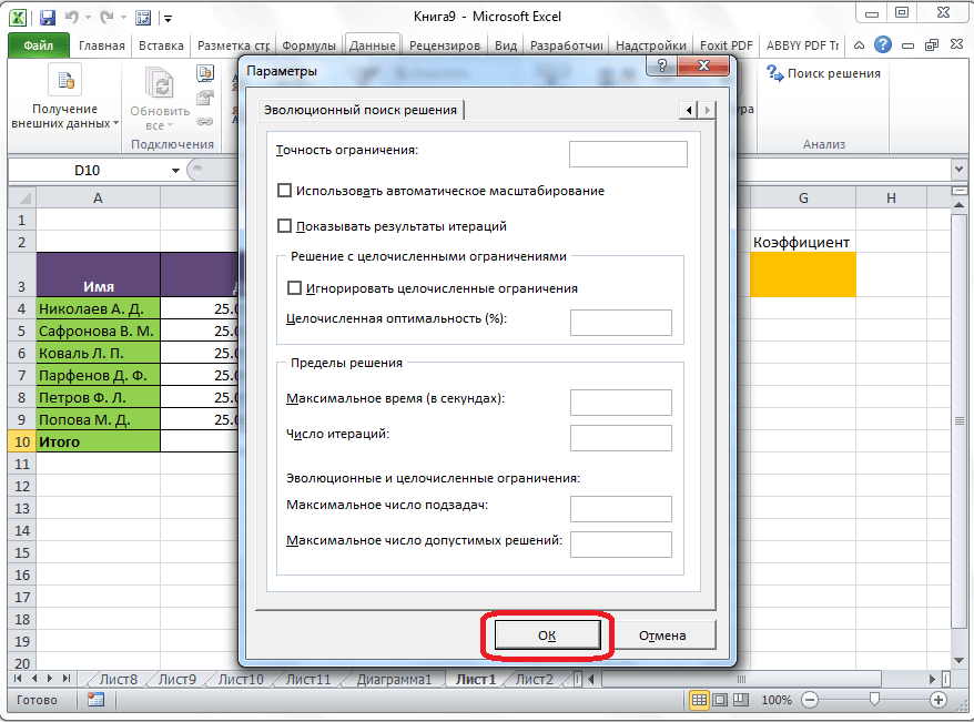 Здесь можно установить точность ограничения и пределы решения. Когда нужные данные введены, жмите на кнопку «OK». Но, для нашего случая, изменять эти параметры не нужно.