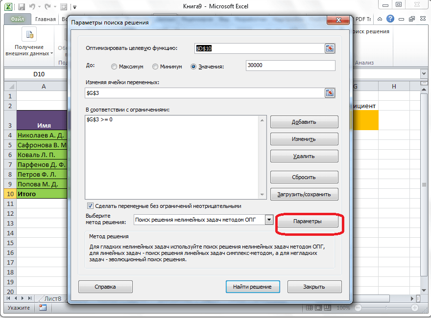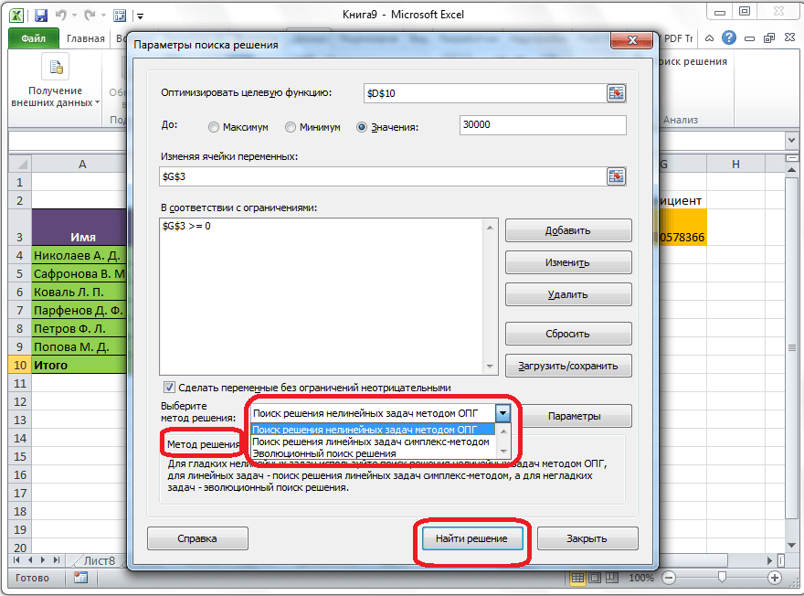 Если по какой-либо причине результаты поиска решений вас не удовлетворяют, или при их подсчете программа выдаёт ошибку, то, в таком случае, возвращаемся, описанным выше способом, в диалоговое окно параметров. Пересматриваем все введенные данные, так как возможно где-то была допущена ошибка. В случае, если ошибка найдена не была, то переходим к параметру «Выберите метод решения». Тут предоставляется возможность выбора одного из трех способов расчета: «Поиск решения нелинейных задач методом ОПГ», «Поиск решения линейных задач симплекс-методом», и «Эволюционный поиск решения». По умолчанию, используется первый метод. Пробуем решить поставленную задачу, выбрав любой другой метод. В случае неудачи, повторяем попытку, с использованием последнего метода. Алгоритм действий всё тот же, который мы описывали выше.