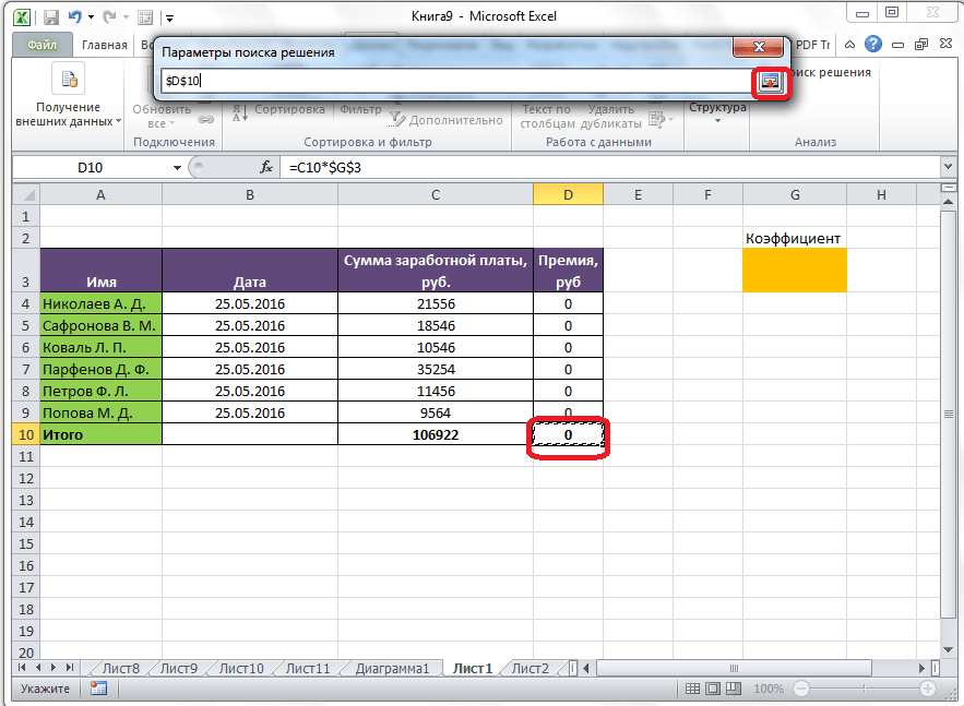 Коэффициент, который применяется для расчета суммы премии, нам предстоит вычислить с помощью функции Поиска решений. Ячейка, в которой он располагается, называется искомой.