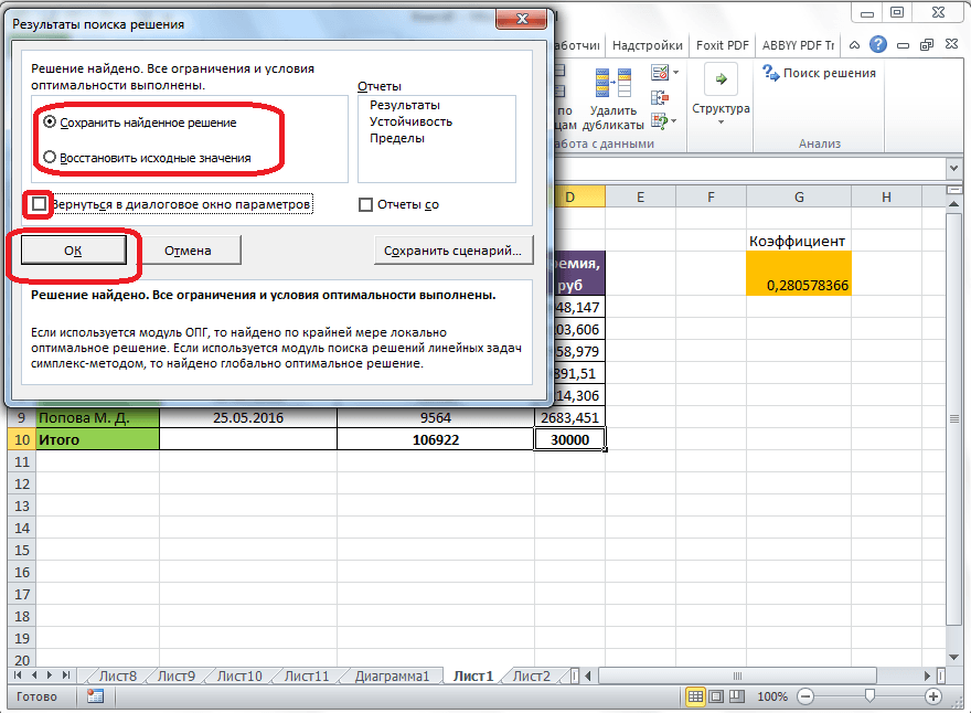 Далее, программа Эксель в ячейках выполняет необходимые расчеты. Одновременно с выдачей результатов, открывается окно, в котором вы можете либо сохранить найденное решение, либо восстановить исходные значения, переставив переключатель в соответствующую позицию. Независимо от выбранного варианта, установив галочку «Вернутся в диалоговое окно параметров», вы можете опять перейти к настройкам поиска решения. После того, как выставлены галочки и переключатели, жмем на кнопку «OK».