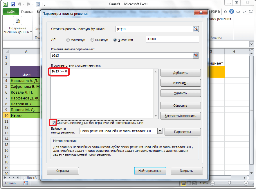 Как видим, после этого, ограничение появляется в соответствующем поле окна параметров поиска решения. Также, сделать переменные неотрицательными, можно установив галочку около соответствующего параметра чуть ниже. Желательно, чтобы установленный тут параметр не противоречил тем, которые вы прописали в ограничениях, иначе, может возникнуть конфликт.