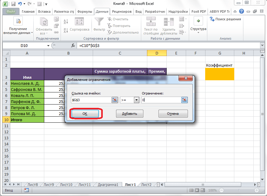 Целевая и искомая ячейка должны быть связанны друг с другом с помощью формулы. В нашем конкретном случае, формула располагается в целевой ячейке, и имеет следующий вид: «=C10*$G$3», где $G$3 – абсолютный адрес искомой ячейки, а «C10» — общая сумма заработной платы, от которой производится расчет премии работникам предприятия.