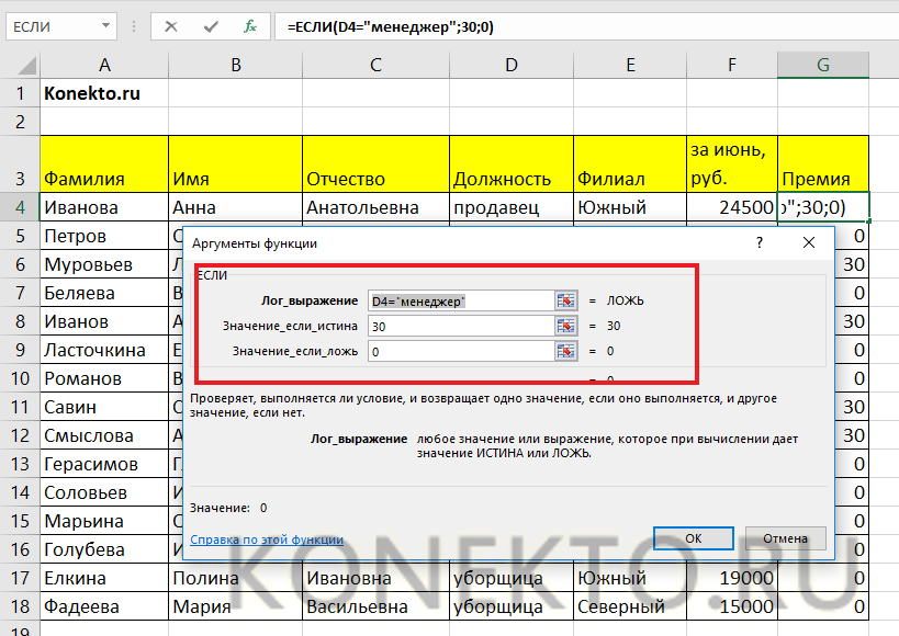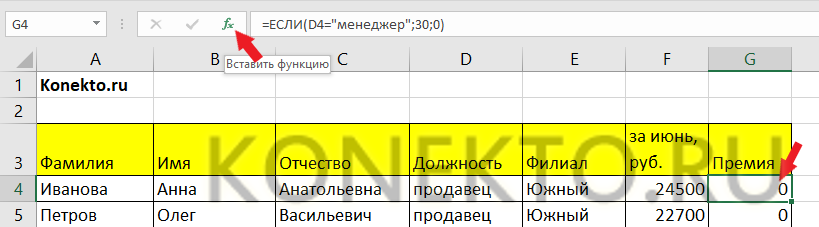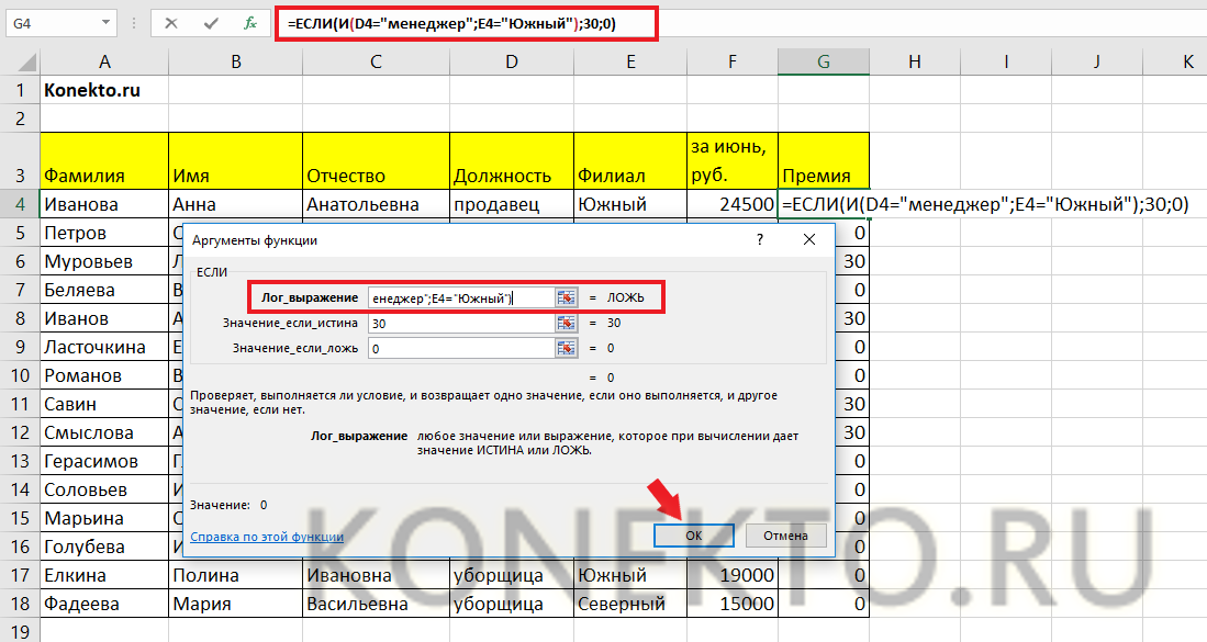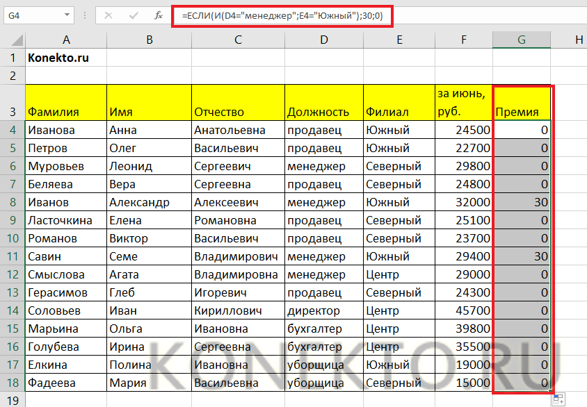 Часто одним условием дело не ограничивается — например, нужно начислить премию только менеджерам, которые работают в Южном филиале компании. Действуем следующим образом: