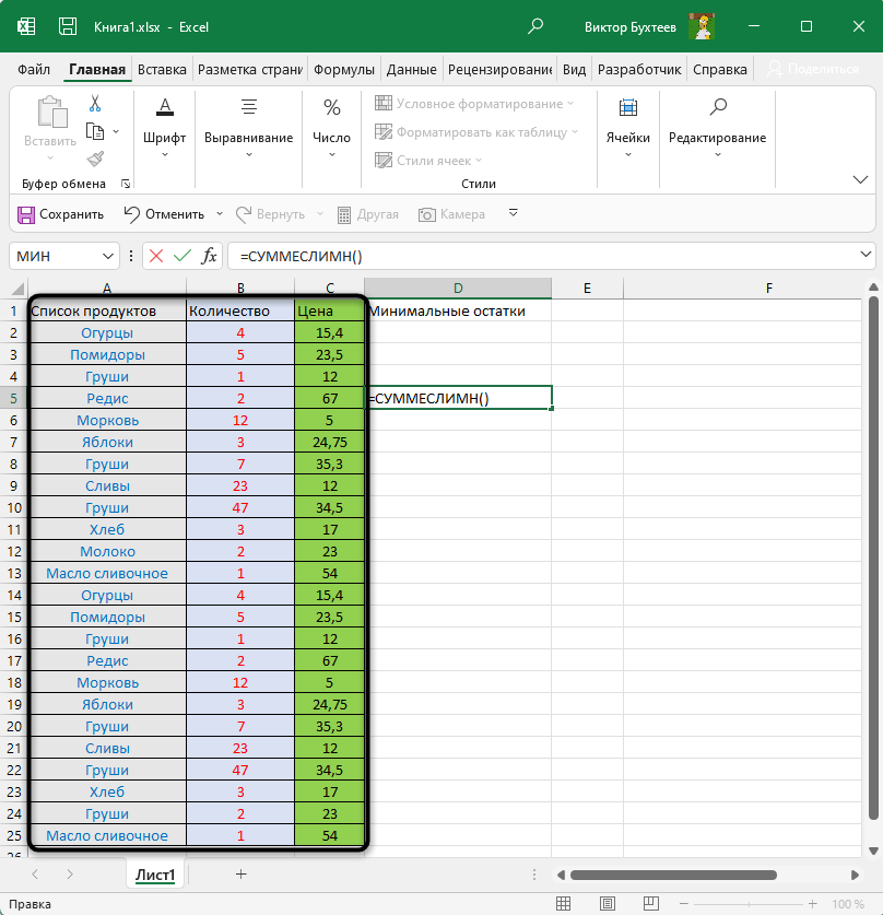 Последний пример – функция СУММЕСЛИМН, которая похожа на предыдущую, но позволяет работать со множеством аргументов. Возьмем таблицу, где указано наименование продукции с некоторыми одинаковыми названиями, есть разная цена и количество.
